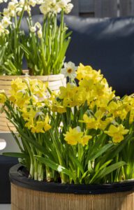 Plant daffodils between September and November – before the first frost – because they need a cold period to flower in spring. Choose a sunny spot or one in light shade, with well-drained soil. Use large pots or containers with drainage holes and mix some sand into the potting soil. Plant the bulbs two to three times as deep as their height, with the tip facing up. After flowering, you can deadhead the blooms but leave the leaves alone until they yellow: the bulb will then store energy for the next year.
